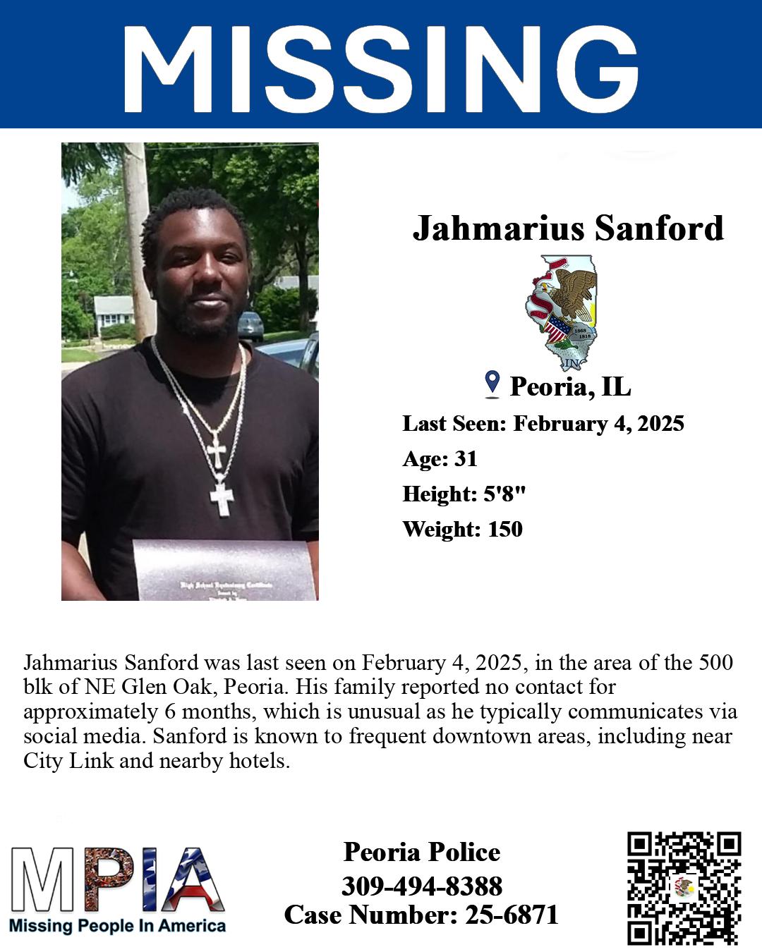 Jahmarius Sanford was last seen on February 4, 2025, in the area of the 500 blk of NE Glen Oak, Peoria. His family reported no contact for approximately 6 months, which is unusual as he typically communicates via social media. Sanford is known to frequent downtown areas, including near City Link and nearby hotels.